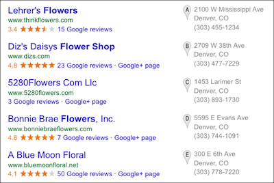 A local search is a query that involves a keyword along with a geographic location. You probably do local searches all the time when looking for a business in your area. Looking back at Marty's flower shop in Denver, Colorado a local search would be just that, "denver colorado flower shop", or something similar.